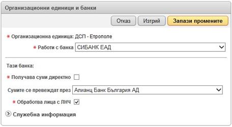 Отделните организационни единици на АСП сключват свои договори за обслужване на плащанията със съответните териториални подразделения на банките. Настройката на обработваните банки позволява да се укаже дали една банка обработва собствените си данни сама, или те се обработват от избрана друга банка. По този начин, при избор на банка, във ведомостта могат да се включат не само IBAN-и на избраната банка, но и такива на други банки, които тя обработва. По-долу е показан екран за избор на настройваната банка:
